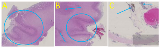 Post-mortem cerebral and ocular examination, hematoxylin and eosin staining, original magnification x10. (A) Right occipital cortical plate with polymicrogyria and extreme thinning of the subplate. (B) Right temporal polymicrogyria with lamina dissecans, heterotopic neurons (arrow), and periventricular nodule (blue circle). (C) Chorioretinal scars (arrows) with hyperpigmentation suggestive of chorioretinitis on the right optic disc.