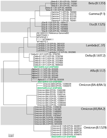All the samples with a band visible to the naked eye on the agarose gel were purified using GPSpin PCR Kit (GPS™, Alicante, Spain) and eluted with 30 µL of DNase/RNase free water. The amount (ng/µL) of DNA was determined studying 2 µL of the sample in the spectrophotometer DS-11 (Denovix, Wilmington, DE, USA). Between 10–30 ng/µL of each purified PCR product and sequencing primers at 5 µM were mixed with a final volume of 10 µL and submitted to GATC (Eurofins Genomics, Coralville, IA, USA) services for Sanger-based sequencing. Resulting sequences were analysed by comparison with a S-gene sequence reference database. Five S-gene 921 bp fragment sequences of each variant were included into this reference database, corresponding with the most diverse genomes for each variant (Table A2) harvested from the GISAID public database. Alignment and phylogenetic analysis were performed by using the Mega 11.0.10 software [25] with the neighbour-joining method [28] and bootstrap values for 1000 replicates. Alongside this, phylogenetic analysis of obtained sequences and sequences retrieved from the reference database were achieved by using a newly developed program, which is available with a simple graphical user interface (GPS™, Alicante, Spain) following the designer’s instructions.