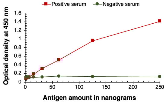 The following equations were used for diagnostic sensitivity and specificity [,], respectively: 100 × the number of true positive values (TP) divided by the sum of the number of true positive values (TP) plus the number of false negative values (FN); or 100 × TP/(TP + FN), and 100 × the number of true negative values (TN) divided by the sum of the number of true negative plus the number of false positive (FP) values, or 100 × TN/(TN + FP) [,]. Lastly, the area under the curve (AUC) and the Youden Index (J = sensitivity+specificity-1) helped to estimate the overall ability of IgM, IgG, and IgA assay to distinguish between healthy and diseased specimens [,]. AUC or J values range between 0 to 1, wherein values closer to 1 suggest that the ELISA can effectively discriminate between the healthy and diseased samples [,]. The division of samples for sensitivity and specificity analysis is provided in Supplementary Tables S1–S3.