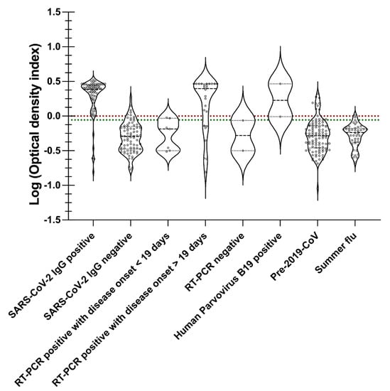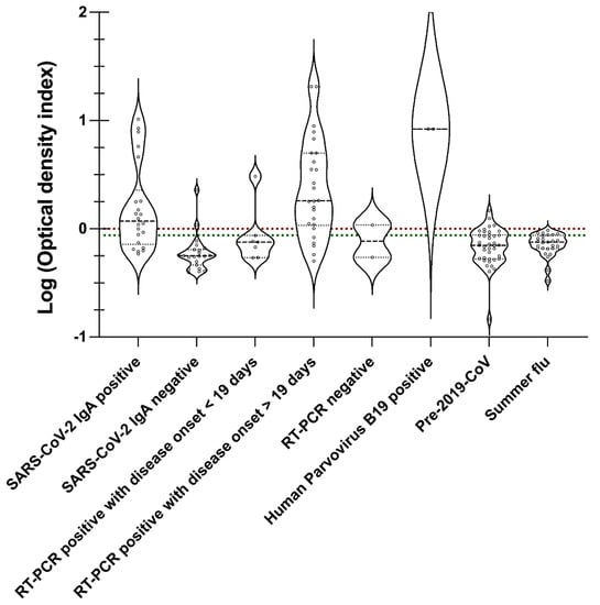 Screening of samples (Table 1) by SARSPLEX for IgM (n = 202), IgG (n = 293), and IgA (n = 139) immune responses to the S and N proteins of SARS-CoV-2 is provided in Figure 5, Figure 6 and Figure 7, respectively. The IgM cut-off (dotted red line) and borderline (dotted green line) were calculated using ROC analysis (Figure 4A). Table S1 demonstrates line data for each specimen used in Figure 5 for IgM clinical validation. Within each violin plot (Figure 4), the black dashed line represents the median distribution of Log (ODI) values in a particular specimen category. Likewise, the dotted line below and above the median denote 25% and 75% quartiles, respectively (Figure 5). For example, the median distribution for SARS-CoV-2 IgM and RT-PCR (≥19 days onset) positive specimens is above the IgM cut-off, but the median distribution is below the cut-off for SARS-CoV-2 IgM negative, pre-2019-CoV, and summer flu patient groups. Table S1 demonstrates line data for each specimen used in Figure 5 for IgM clinical validation.