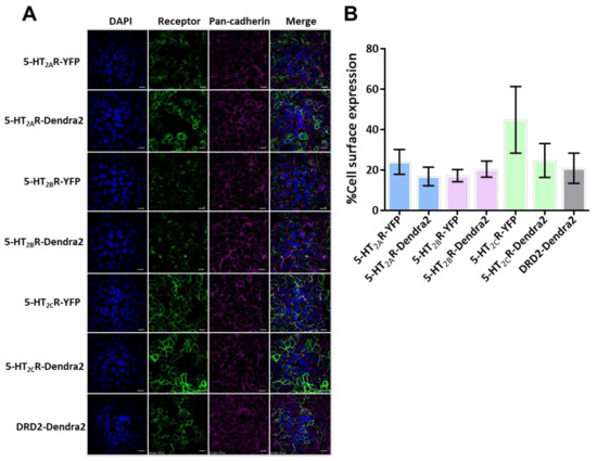 5-HT2R-Dendra2 fusion protein-expressing HEK293A stable cells were plated to 60% confluency in a 6 mm 96 wells (#1.5H) glass bottom plate (CellVis) along with control samples in complete DMEM with 500 µg of G418 (Corning). At 24 h post-plating, cells were washed with 1× PBS and fixed using 4% PFA (Invitrogen) for 10 min and washed again three times with 1× PBS. After washing, cells were incubated with blocking buffer (2% goat serum, 0.2% Triton X-100 and 0.1% BSA in 1× PBS) at RT for 1 h and then stained with an anti-pan-cadherin antibody (1:200, Abcam) in blocking buffer t at 4 °C O/N. Cells were washed three times with 1× PBS and stained with a secondary anti-mouse Alexa Fluor-647 antibody (1:1000) in blocking reagent at RT for 1 h. Furthermore, cells were washed and stained for nuclear marker using DAPI counterstain (1:1000) at RT for 5 min. After the final washes, cells were observed by confocal microscopy using an Olympus laser scanning confocal microscope (model IX81; Olympus America, Inc., Westborough, MA, USA) at 60× magnification (oil immersion) using FluoView software (version 04.01.01.05). Fields of view were visualized through z-sectioning using the DAPI channel, and fluorescence images were obtained for cell nuclei (blue), receptor/control (green) and anti-pan cadherin (magenta) channels using 405/635-, 543/488-nm multiline argon laser, and a 633 HeNe laser, respectively. Cell-surface expression of receptors was determined using ImageJ by defining Manders’ overlap coefficient utilizing colocalization threshold analysis (FIJI) [91]. Each field of view in comparable z-planes was analyzed and represents the percentage of overlap between the pan-cadherin cell-surface marker and Dendra2/YFP expression for expressed receptors. Data were plotted in a box graph and statistics were calculated using GraphPad Prism (GraphPad Software, Inc., San Diego, CA, USA).