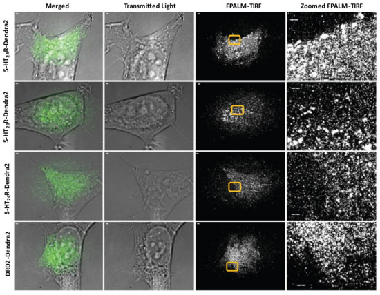 Proper expression of membrane-bound receptors is vital to the utilization of the receptors by ligands and downstream events [97] including viral infection [98]. To define the spatial distribution of 5-HT2Rs in HEK293A cells, FPALM-TIRF microscopy was employed to visualize and characterize the Dendra2-fused receptors on the plasma membrane (Figure 2). Cell lines stably expressing receptors were plated on 96-well glass-bottom dishes and fixed 24 h after plating. FPALM-TIRF imaging of the Dendra2-expressing 5-HT2Rs revealed a clustered distribution of receptors on the plasma membrane for each 5-HT2R subtype (5-HT2A, 5-HT2B, and 5-HT2C) (Figure 2). The observed distribution in the plasma membrane suggests that the receptors are (a) present on the cell surface and (b) clustered in a manner similar to that of other cell membrane-bound receptors viewed via TIRF microscopy in previous studies [99].