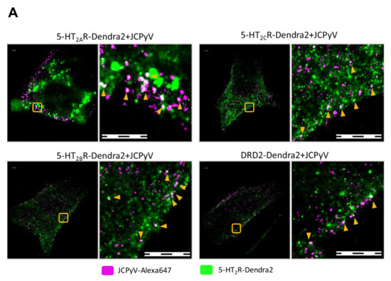 The following supporting information can be downloaded at: https://www.mdpi.com/article/10.3390/v14122597/s1, Figure S1: Generation of 5-HT2R constructs.; Figure S2: Infectivity assay for 5-HT2R-Dendra2 expressing HEK293A cells.