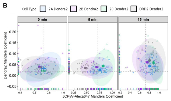 Data from FPALM images of infected 5-HT2-expressing cells show that JCPyV colocalizes with 5-HT2 receptors during the viral attachment and entry process. Even though JCPyV colocalization was observed at all three time points (0, 5, and 15 min) postinfection, the colocalization of JCPyV was observed to be significantly higher with 5-HT2 receptors compared to DRD2-receptors at 5 mpi (Figure 3). Published data strengthen our results showing higher colocalization of JCPyV with 5-HT2 receptors at 5 mpi [65,68]. These data suggest the persistent colocalization of JCPyV with 5-HT2 receptors through viral attachment and entry might cause changes in the clustering of 5-HT2 receptors.