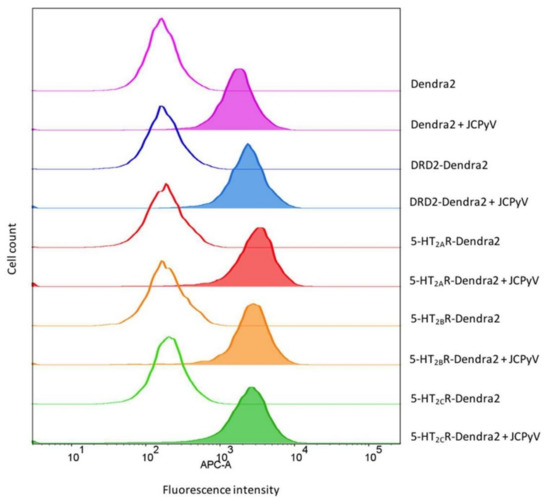 JCPyV binds to host cells through α2,6-linked sialic acid receptor motifs and/or non-sialylated glycosaminoglycans (GAGs) via the attachment protein VP1 [62,63,64,100], and internalization is mediated by 5-HT2 receptors [65,66]. Previous research has demonstrated that viral attachment to host cells remains unaffected upon the expression of 5-HT2 receptors when compared to control cells [66], suggesting that attachment and entry constitute a two-step process. A JCPyV infectivity assay using cell lines stably expressing 5-HT2Rs, DRD2, or Dendra2 showed a significant increase in JCPyV infectivity of 5-HT2Rs-expressing cells compared to DRD2- and Dendra2-expressing cells (Figure S2), confirming previous findings [66]. To test whether stable cell lines expressing Dendra2-tagged 5-HT2 receptors show enhanced JCPyV attachment, flow cytometry was used to quantify viral attachment as a function of receptor subtype. Stable cells expressing 5-HT2Rs, DRD2, or Dendra2 were plated, incubated for 24 h, removed from plates, and incubated with JCPyV-647 on ice for 1 h. JCPyV-647 attachment was measured in virus-treated and mock samples using flow cytometry (Figure 4). Equivalent levels of JCPyV-647 mean fluorescence intensities were observed in cells expressing 5-HT2Rs, DRD2, and Dendra2, suggesting that JCPyV attachment is not significantly affected by overexpression of 5-HT2Rs or DRD2. This confirms that the stable cells do not enhance or reduce viral attachment to host cells, and these data are consistent with previously-reported results with 5-HT2R-YFP [66].