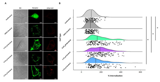 Previous studies have established that JCPyV infection is increased when 5-HT2Rs are overexpressed in semi-permissible cells, such as HEK293A cells [66] and Figure S2. Further, the 5-HT2R-mediated increase in JCPyV infection is attributed to a significant enhancement of viral internalization [65,66,67]. To determine whether the expression of Dendra-tagged 5-HT2Rs or DRD2 increases the internalization of JCPyV in stable cells, viral entry was measured using confocal microscopy. Stable cell lines expressing Dendra2-tagged 5-HT2Rs, DRD2, or Dendra2 were plated and incubated with JCPyV-647 on ice to synchronize viral attachment, then further incubated at 37 °C for 1.5 h for viral entry. Cells were fixed and viral internalization was measured by confocal microscopy. The quantification of the relative fluorescence intensity of JCPyV-647 within individual cells was determined using ImageJ [67,101]. Representative confocal images of individual samples for viral internalization (Figure 5A) demonstrate an increase in JCPyV-647 fluorescence in 5-HT2R-expressing samples compared to DRD2 and Dendra2 samples. Quantification was performed to measure internalized JCPyV-647 by generating cell masks in ImageJ, and then by measuring fluorescence intensities inside individual cells, excluding the cell membrane (Figure 5B) (similar to [101] but with the mask generation performed manually). Stable cells expressing 5-HT2Rs demonstrated a significant increase in viral internalization when compared to DRD2- and Dendra2-expressing stable cells. Taken together, these data demonstrate that the stable cell lines expressing Dendra2-tagged 5-HT2Rs support and enhance JCPyV internalization with equivalent efficiency. These data further suggest that while JCPyV localizes in membrane areas where DRD2 is expressed (Figure 3, Table 1), DRD2 does not enhance viral entry [66].