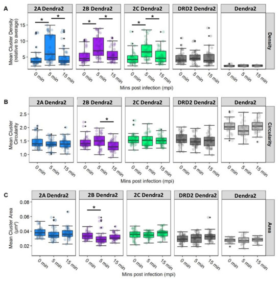 5-HT2R cluster properties for receptors subtypes in infected cells. Cluster properties including (A) mean cluster density, (B) circularity, and (C) area were calculated for localizations of 5-HT2R-Dendra2 subtypes, DRD2-Dendra2 (Dopamine Dendra2), and Dendra2 in stable cells fixed at 0, 5, and 15 mpi and analyzed by widefield FPALM. Clusters were identified by binning molecules onto a grid and convolving with a circle (radius 50 nm) and thresholding for regions with density ≥3 times the cell average. The columns represent sample conditions, and rows represent the physical characteristics of clusters for each sample. In individual graphs, the y-axis indicates the value for each cluster characteristic, while the x-axis represents the 3 different time points. Cluster density is significantly increased at 5 mpi in cell types that support JCPyV infection. The Kruskal–Wallis test was used to compare the intensity values of each cluster property comparing all timepoints within each cell type. The symbol * indicates p < 0.05. Outliers are represented by black diamonds.
