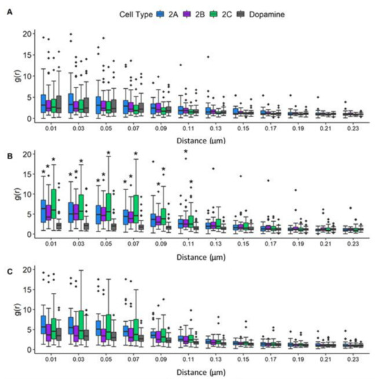 JCPyV aggregates significantly under 5-HT2R subtypes at 5 min post-infection. The radial distribution function (RDF) was analyzed to determine the spatial distribution of 5-HT2R-Dendra2, DRD2-Dendra2, and JustDendra2 (control) clusters at (A) 0, (B) 5, and (C) 15 mpi using widefield FPALM images. The Kruskal-Wallis test was used to compare the RDF values at each distance measured in each cell comparing all cell types across each timepoint. The symbol * indicates significant differences (p < 0.01). The RDF value (y-axis) denotes the density of molecules as a function of distance from the cluster center (r, x-axis), with an RDF value of 1 indicating the density expected for a random distribution. Populations represent ~30 cells per time point per sample from three independent experiments, representative of an average of three independent replicates. Outliers are represented by black diamonds.