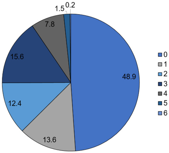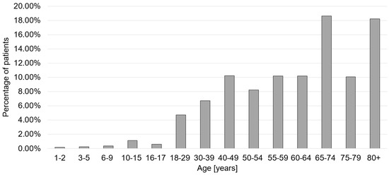 In 2021, 543,789 patients were hospitalized with a coded diagnosis of COVID-19 (Table 1). Out of these, 123,982 patients (60.6% male) received ICU treatment, whereby the majority of patients were aged 65–74 years (23.5%). The mean ICU stay was 18.9 days. In addition, 69,293 in-house deaths were identified (58.4% male, 53.6% older than 80 years). A total of 29,808 patients could be identified with PCS yielding a prevalence of 5.5%. The majority of patients (18.6%) were aged 65–74 years (Figure 1). In the PCS cohort, 1330 (4.5%) in-hospital deaths were recorded, and 5140 (17.2%) patients required ICU treatment (Table 1). Furthermore, 624 (2.09%) patients received level-1 care, 3055 (10.25%) level-2 care, 2405 (8.07%) level-3 care, 1069 (3.59%) level-4 care, and 5450 (1.51%) level-5 care. The mean length of hospital stay was 11.5 days. In about half of the cases, the clinical complexity was low (Figure 2).