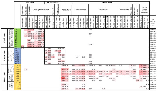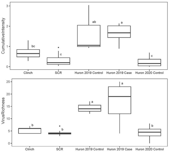 Richard, J.C.; Leis, E.M.; Dunn, C.D.; Harris, C.; Agbalog, R.E.; Campbell, L.J.; Knowles, S.; Waller, D.L.; Putnam, J.G.; Goldberg, T.L. Freshwater Mussels Show Elevated Viral Richness and Intensity during a Mortality Event. Viruses 2022, 14, 2603. https://doi.org/10.3390/v14122603