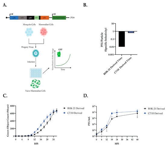 The growth of the Sindbis virus (SINV) derived from both mosquito and mammalian cells on human embryonic kidney 293 (HEK-293) cells was examined (Figure 1A). SINV with a translationally fused green fluorescent protein (GFP) reporter in nonstructural protein 3 (SINV-nsP3-GFP) [23] was grown in either baby hamster kidney (BHK-21) cells or Aedes albopictus (C7/10) cells for 24 or 48 h, respectively. The virus containing supernatant was then removed and purified over a 27% sucrose cushion in HNE buffer before being resuspended in HNE buffer. The BHK-21- and C7/10-derived viruses were plaqued and used for reverse transcription to determine total genomes using qRT-PCR. The C7/10-derived virus had a specific infectivity (PFU/Genomes) of 0.61 and the BHK-21-derived virus had a specific infectivity of 0.01 (Figure 1B). These numbers fall within the previously reported range for Sindbis virus-specific infectivity [1,3,24]. HEK-293s were synchronously infected at an MOI of 5 PFU/cell with either mammalian-derived (BHK-21 derived) or mosquito-derived (C7/10 derived) SINV-nsP3-GFP (Figure 1C,D). After absorption at 4 °C the cells were removed, and prewarmed (37 °C) media was added. The HEK-293 cells were analyzed by IncuCyte, measuring fluorescence per cell, and growth medium was sampled at each time point to determine infectious titer (Figure 1D). The mosquito-derived virus not only replicated faster but also produced a more infectious virus during infection (Figure 1C,D). Two-way ANOVA with Sidak’s multiple comparison test showed an effect on both time and viral progeny background from the Incucyte data: time—p < 0.0001, viral progeny background—p < 0.0001, time × viral progeny background—p = 0.0057 (Figure 1C). From this, we conclude that mosquito-derived viruses are replicating faster than mammalian-derived viruses on HEK-293 cells, as well as producing more infectious viruses. These results are in line with previous data suggesting that mosquito-derived SINV is more infectious on mammalian cells [1,3,5].