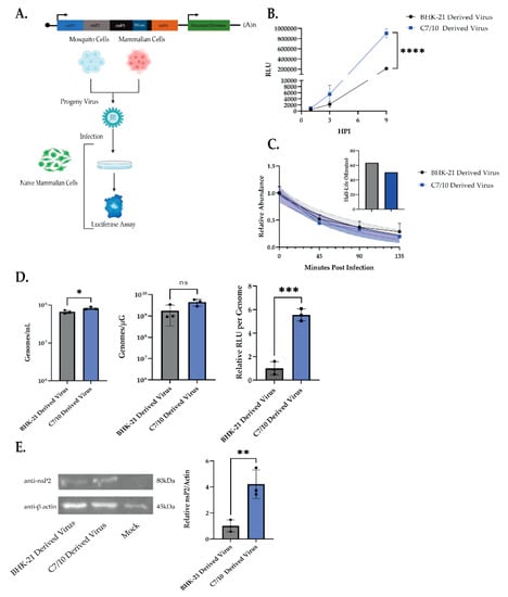 To confirm that the increased translation is due to differences in the genomic RNA, we performed an in vitro translation assay using purified viral genomic RNA as described in Materials and Methods. Briefly, genomic vRNA was purified and quantified as previously described, and 108 genomes were added to the Rabbit Reticulocyte Lysate per the manufacturer’s instructions. Following a 90 min incubation at 30 °C, luciferase was measured. We found significantly more luciferase activity from the C7/10-derived vRNA template as compared to BHK-21-derived vRNA (Figure 3C).