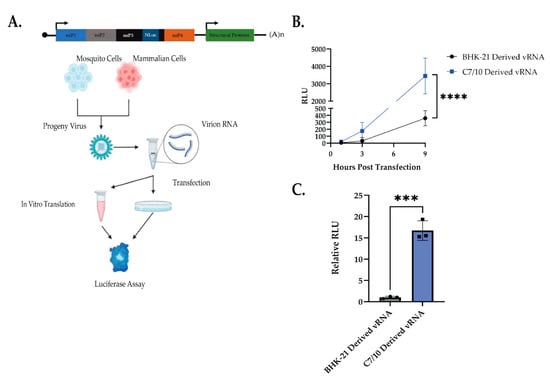 Purified viral RNA phenocopies encapsidated virions. (A) Schematic representation of experiment performed. (B) A total of 108 copies, determined by qRT-PCR, each of viral RNA extracted from BHK-21- and C7/10-derived viruses were transfected into naïve HEK-293 cells. Cell lysates were harvested at the indicated times and luciferase activity (RLU) was used as a proxy for viral replication. Error bars represent SEM of biological replicates (n = 3) Two-way ANOVA using Sidak’s multiple comparisons: Time—p < 0.0001, BHK/C7-derived vRNA—p = 0.005, time × BHK/C7-derived vRNA—p = 0.0004. **** p < 0.0001. (C) A total of 108 copies each of viral RNA extracted from BHK-21- and C7/10-derived viruses were used for in vitro translation using Rabbit Reticulocyte Lysate (Promega). RLU was standardized to BHK-21-derived vRNA. Error bars represent SEM of biological replicates (n = 3). Student’s t-test: p *** = 0.0003.