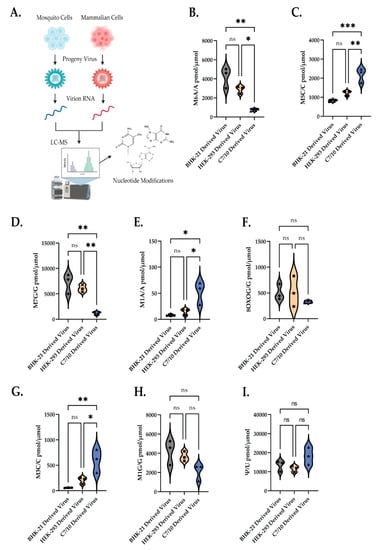 LC/MS analysis reveals species specific modifications acquired by SINV. (A) Schematic of liquid chromatography in tandem with mass spectrometry experiment. (B) Normalized 6-methyl adenosine (m6A) content of RNA isolated from BHK-21-, HEK-293-, and C7/10-derived virus represented as a ratio of total unmodified adenine content. (n = 3) Tukey’s multiple comparison test: p * = 0.0176, p ** = 0.0016. ns = no significance (C) Normalized 5-methyl cytosine (m5C) content of RNA isolated from BHK-21-, HEK-293-, and C7/10-derived virus represented as a ratio of total unmodified cytosine content. (n = 3) Tukey’s multiple comparison test: p ** = 0.0055, p *** = 0.0009. (D) Normalized 7-methyl guanine (m7G) content of RNA isolated from BHK-21-, HEK-293-, and C7/10-derived virus represented as a ratio of total unmodified guanine content. (n = 3) Tukey’s multiple comparison test: BHK-21 ** p = 0.0022, HEK-293 p ** = 0.0062. (E) Normalized 1-methyl adenosine (m1A) content of RNA isolated from BHK-21-, HEK-293-, and C7/10-derived virus represented as a ratio of total unmodified adenine content. (n = 3) Tukey’s multiple comparison test: BHK-21 p * = 0.0136, HEK-293 p * = 0.0281. (F) Normalized 8-oxoguanine (8oxoG) content of RNA isolated from BHK-21-, HEK-293-, and C7/10-derived virus represented as a ratio of total unmodified guanine content. (n = 3) Tukey’s multiple comparison test. (G) Normalized 3-methyl cytosine (m3C) content of RNA isolated from BHK-21-, HEK-293-, and C7/10-derived virus represented as a ratio of total unmodified cytosine content. (n = 3) Tukey’s multiple comparison test p * = 0.0309, p ** = 0.0074. (H) Normalized 1-methyl guanine (m1G) content of RNA isolated from BHK-21-, HEK-293-, and C7/10-derived virus represented as a ratio of total unmodified guanine content. (n = 3) Tukey’s multiple comparison test. (I) Normalized pseudouridine (Ψ) content of RNA isolated from BHK-21-, HEK-293-, and C7/10-derived virus represented as a ratio of total unmodified uridine content. (n = 3) Tukey’s multiple comparison test.