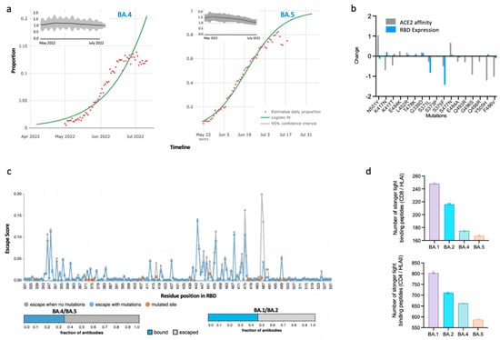 Characteristics of Omicron BA.4 and BA.5 variants. (a) Relative growth advantage of the BA.4 and BA.5 variant obtained by the logistic fitting of the proportion of SARS-CoV-2 variant sequences globally. The relative growth advantage estimates are based on the proportion of the specific variant (BA.*)-positive sequences over a period of time as compared to cocirculating strains. The model assumes that the current advantage is due to a transmission advantage, which is contributed to by the immune evasion capabilities, transmission characteristics, or prolonged infection time. Adapted from Chen C et al. [4]. The insets depict temporal variations in the current reproduction number along the emergence of BA.4 or BA.5 variants. (b) Effects of RBD mutations on ACE2 binding affinity (gray) and RBD expression in S protein. Adapted from Starr TN et al. [12]. (c) Prediction of immune escape and polyclonal antibody evasion upon mutations in ancestral SARS-CoV-2. Orange dots indicate mutations in RBD. The horizontal stacked bar graph shows the fraction of polyclonal antibodies which can bind or escape from the BA.4/5 omicron variant (Left) and BA.1/2 variants (Right). Adapted using “Escape calculator for SARS-CoV-2 RBD” [13]. (d) Number of strongly tight binding peptides to HLA 1 and HLA II in the BA.1, BA.2, BA.3, and BA.5 variants. Adapted from Nersisyan et al. [14].