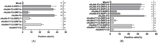 For future determination of the regions which contribute to the infection efficiency on PAMs, NSP1-2, NSP3-8, ORF2-4 and ORF5-6 were exchanged between rHuN4-F5 and rHuN4-F112. Results showed that significant differences were found when the parent viruses changed the NSP2 region; however, changes were also found between rHuN4-F112-ORF2-4 and rHuN4-F112 (Figure 2B,D).