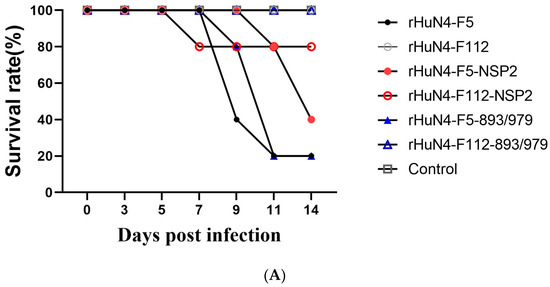 After infection, piglets infected with rHuN4-F5 manifested various diseases, including persistent high fever and anorexia, and four piglets died. Persistent high fever was found in piglets belonging to the rHuN4-F5 group from 4 to 6 dpi; however, piglets in rHuN4-F112 did not show any clinical symptoms. Two and one piglets died in the rHuN4-F5-NSP2 and rHuN4-F112-NSP2 groups, respectively. None of the piglets in these groups showed persistent high fever. Four piglets died in the rHuN4-F5-893/979 group and persistent high fever was found from 4 to 9 dpi. No clinical symptoms were found in the rHuN4-F112-893/979 groups (Figure 4A,B).