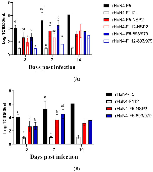 Significant higher virus copies were found in group rHuN4-F5 compared with other groups at 3 (with the exception of rHuN4-F5-NSP2 group) and 7 dpi (with the exception of the rHuN4-F5-893/979 group) (Figure 5A). For the chimeric viruses with rHuN4-F5 backbone, significant lower viremia was found in the rHuN4-F5-NSP2 and rHuN4-F5-893/979 groups at 3 and 7 dpi (Figure 5B). For the chimeric viruses with rHuN4-F112 backbone, significant higher viremia was found in the rHuN4-F112-NSP2 group at 3 dpi (Figure 5C).