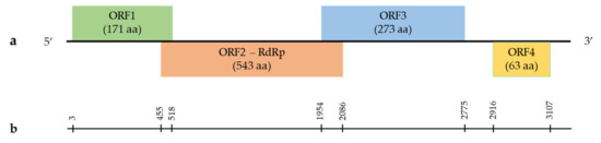 The genome of umbraviruses is represented by a linear (+) single-stranded RNA (ssRNA) that has four open reading frames (ORFs) [78]. Based on the analysis of the nucleotide sequence of GULV isolates in the ORF Finder program, four ORFs were predicted (Figure 1). The 516 bp ORF1 encodes a 171 amino acid (aa) peptide with an unknown function. The blastp analysis showed the highest identity with ORF1 of the WULV sequence (pairwise identity of 45.51–47.02%, query cover of 99–100%). ORF1 overlaps with the 1632 bp ORF2 sequence encoding a 543 aa protein with a predicted function of RNA-dependent RNA polymerase (RdRp). The blastp analysis showed the highest identity at the amino acid level with the RdRp sequences of WULV (pairwise identity of 68.49–68.70%, query cover of 85%) and StrVA (pairwise identity of 59.77–61.19%, query cover of 92–97%). ORF3 (822 bp in length) overlaps with ORF2 and encodes a 273 aa peptide with an unknown function. ORF4 is 192 bp long and encodes a 63 aa peptide.