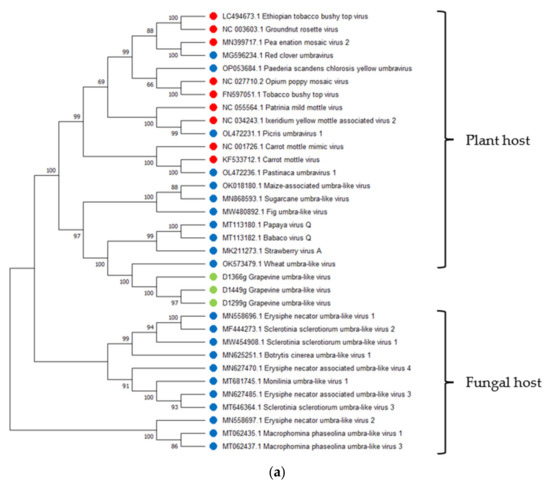 - Nabeshima, T.; Abe, J. High-Throughput Sequencing Indicates Novel Varicosavirus, Emaravirus, and Deltapartitivirus Infections in Vitis coignetiae. Viruses 2021, 13, 827. [Google Scholar] [CrossRef]