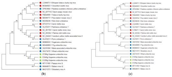 - Ryabov, E.V.; Taliansky, M.E.; Robinson, D.J.; Waterhouse, P.M.; Murant, A.F.; de Zoeten, G.A.; Falk, B.W.; Vetten, H.J.; Gibbs, M.J. Genus Umbravirus. In Virus Taxonomy Classification and Nomenclature of Viruses Ninth Report of the International Committee on Taxonomy of Viruses; King, A.M.Q., Adams, M.J., Carstens, E.B., Lefkowitz, E.J., Eds.; Academic Press: London, UK, 2011; Volume 9, pp. 1191–1195. ISBN 1865843830. [Google Scholar]