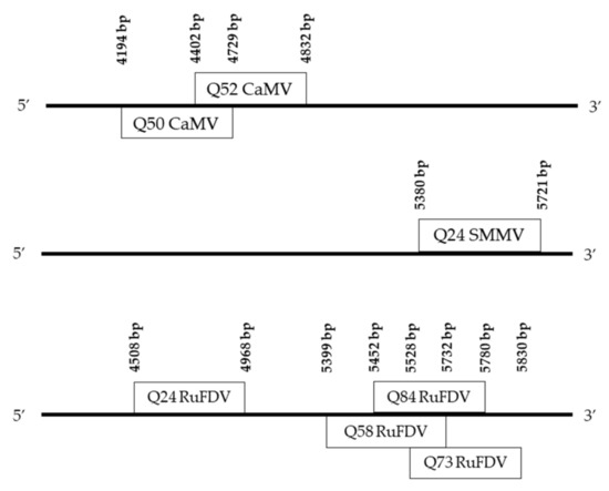- Teycheney, P.Y.; Geering, A.D.W.; Dasgupta, I.; Hull, R.; Kreuze, J.F.; Lockhart, B.; Muller, E.; Olszewski, N.; Pappu, H.; Pooggin, M.M.; et al. ICTV Virus Taxonomy Profile: Caulimoviridae. J. Gen. Virol. 2020, 101, 1025. [Google Scholar] [CrossRef]