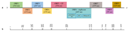 - Geering, A.D.W.; Hull, R. Genus Caulimovirus. In Virus Taxonomy Classification and Nomenclature of Viruses Ninth Report of the International Committee on Taxonomy of Viruses; King, A.M.Q., Adams, M.J., Carstens, E.B., Lefkowitz, E.J., Eds.; Academic Press: London, UK, 2011; Volume 9, pp. 432–434. ISBN 1865843830. [Google Scholar]