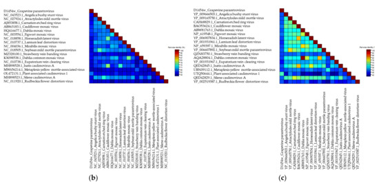 Color-coded pairwise identity matrix including (a) complete genomes, (b) nucleotide sequences of the RNA-dependent RNA polymerase (RdRp), (c) amino acids sequences of the RdRp of grapevine umbra-like virus isolates, representative isolates of the genus Umbravirus and unclassified umbra-like viruses. GenBank accession numbers for each isolate are present by virus isolate names and are also in Supplementary Table S6.