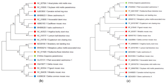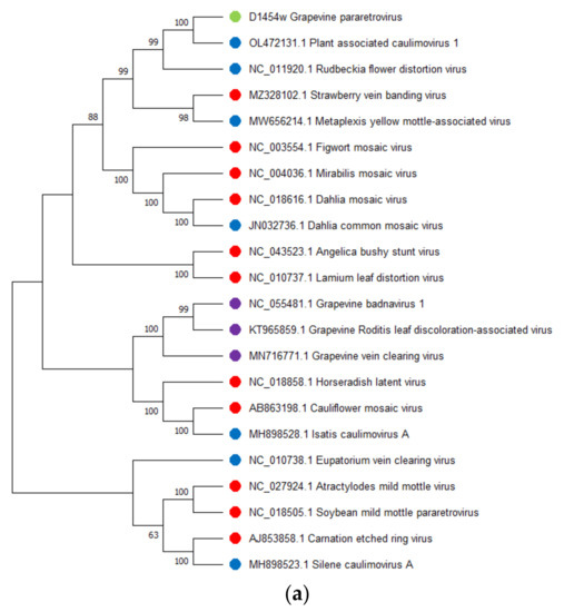 Using HTS, four grapevine viruses with circular single-stranded DNA (ssDNA) genomes and three viruses with double-stranded DNA (dsDNA) genomes have been discovered [6,7]. Among them, there are representatives that cause vein clearing and vine decline disease (grapevine vein clearing virus (GVCV) [16,17], Roditis leaf discoloration disease (grapevine Roditis leaf discoloration-associated virus (GRLDaV)) [18] and red blotch disease (grapevine red blotch virus (GRBV)) [19,20].