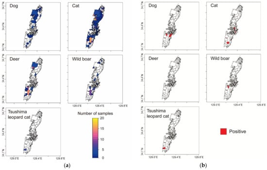 Sites at which animal samples were collected (a) and locations of SFTSV-positive animals (b), depicted using a geographical information system (GIS) based on geo-coordinates using QGIS software, version 2.12.3 (QGIS.org, QGIS Geographic Information System. QGIS Association; http://www.qgis.org, 2021) and R statistical software (R version 4.2.1., R Core Team 2021).