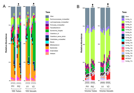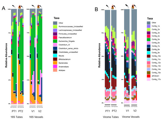 16S sequencing results again showed no significant differences between the treatment and the control fermenters (Figure 3A) and no statistically significant difference was observed between the vessels and the tubes (Supplementary Materials). Despite the efficient propagation of the externally added phage, the overall difference between the treatment and control fermenters was also moderate as reported by Jaccard distances. More importantly, we found no significant difference between the datasets originating from tubes and vessels.