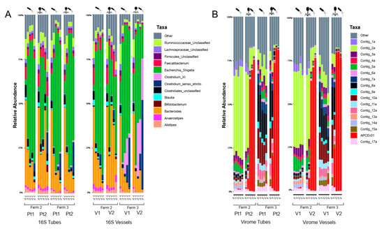 We observed no significant difference between the treatment and the control (phage addition vs. no addition) nor between the fermenter setup (vessels vs. tubes) at the level of resolution provided by 16S rRNA analysis. Other important community measures (α and β diversities) also corroborate these findings ( Supplementary Figures S1, S2 and S4). Virome composition was also indistinguishable within the samples or between the fermenters, while the introduced faecal phage maintained constant abundance in the fermenter (Supplementary Figures S3 and S5).