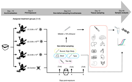 Based on evidence in the literature [13,29], we decided to sample on days 2, 4 and 6 post-exposure, in order to capture the pattern of progression of a ranavirus infection, which we predicted would have a dose-dependent pattern of variation. On each of the sampling days, a third of the frogs were removed from each treatment group (7 per treatment), and non-lethal sampling was conducted (Table 1, Figure 2). Tank swabs and stool samples were collected once the frogs had been removed from the tank. Following this non-lethal sampling, R. temporaria were euthanised via a schedule 1 method which involved immersion in buffered Tricaine Methanesulfonate (MS222) and a non-schedule 1 confirmation of death via submergence in ethanol. Toe clipping/buccal swabbing was performed post-euthanasia to reduce the stress of the frogs, therefore safeguarding amphibian welfare.