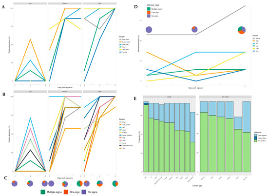 Proportion of samples positive for ranavirus for each individual sampling technique at different time points post-exposure in R. temporaria (left and bottom right) and B. bufo (top right). (A) Non-lethal and (B) Lethal sampling post-exposure for each ranavirus dose. (C) Clinical signs observed post-exposure across the low, medium and high dose treatment groups. (D) Non-lethal and lethal sampling post-exposure in toads. (E) Proportion of results that were true positives, false positives and false negatives for non-lethal and lethal ranavirus sampling in frogs.