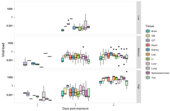 Detectability: Across the experiment as a whole, we detected ranavirus across all tissues in some frogs. Within the low dose treatment, detection of ranavirus occurred only on the middle sampling day and most prominently in the gastrointestinal tract (GIT) and liver. In frogs exposed to a high virus dose, infection increased across all three days, whereas at intermediate dose it appeared to increase then stall (toe, gallbladder, heart, large intestine) or drop slightly (lung, leg, kidney) by the final sampling day (Figure 4). Detectability was highest in the GIT across all treatment groups and sampling days (Table S2) and exhibited significantly higher viral loads across all doses on the majority of sampling days. Specificity amongst tissues ranged from 94–100% and sensitivity from 50–98% (Table S3).