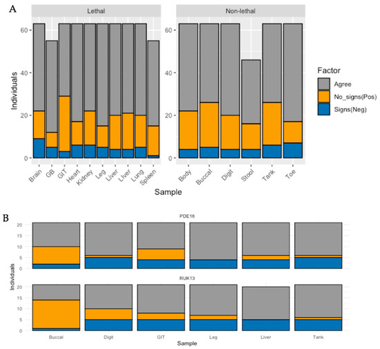 Bar plot illustrating the number of individuals for (A) frogs, and (B) toads that were; positive for ranavirus with each sample type in the absence of clinical signs (orange), the number of individuals negative for ranavirus by sample type in the presence of clinical signs (blue), and the number of individuals in which sample type agrees with absence/presence of clinical signs (grey).