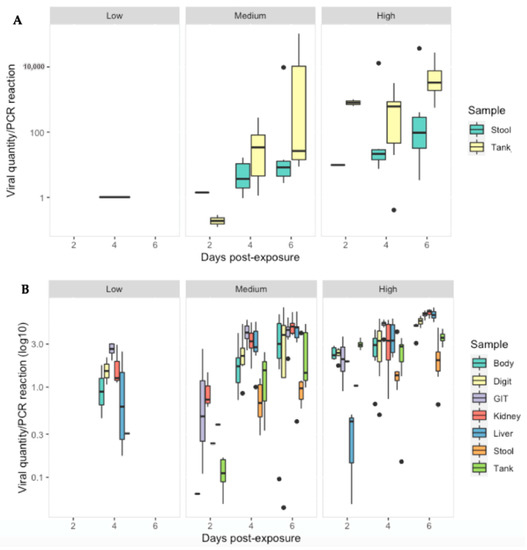 Viral quantity per PCR reaction for: (A) stool and tank swabs and (B) Body, digit and tank swabs, GIT, kidney and liver tissue obtained from R. temporaria from all treatment groups at 2, 4 and 6 days-post exposure to ranavirus. Black dots indicate outliers.