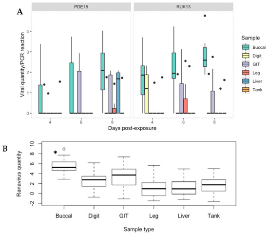 (A) Viral quantity per PCR reaction for buccal, digit and tank swabs, GIT, leg and liver tissue obtained from B. bufo from both virus treatment groups at 4, 6 and 8 days-post exposure. (B) Predicted probabilities of ranavirus quantities per 2 μL PCR reaction generated from the zero inflated gaussian mixed model for sample type as a single factor. Black dots indicate outliers. * p < 0.0001.