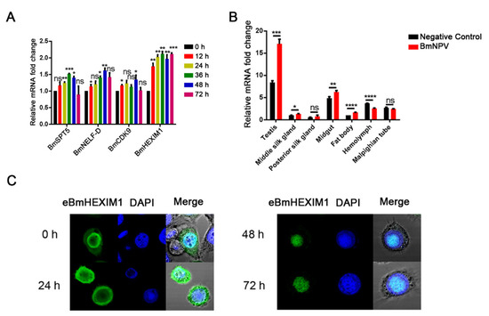 BmHEXIM1 showed a significant response to BmNPV infection. (A) The expression levels of BmHEXIM1 in BmN cells at different hours post infection with BmNPV. BmN cells without BmNPV infection as the control. (B) The expression levels of BmHEXIM1 in different tissues of silkworm post infection with BmNPV. Fat body of silkworm without BmNPV infection as the control. (C) Time course analysis of subcellular localization of BmHEXIM1 by immunofluorescence in BmN cells infected by BmNPV; DAPI, blue; and BmHEXIM1, green. The mRNA level of target genes was normalized to the internal control (BmRPL32). Data represent mean ± SEM of the three independent experiments. The number of asterisks represents the degree of significance with respect to p-value. P-values were provided as * p < 0.05; ** p < 0.01; *** p < 0.001; **** p < 0.0001.