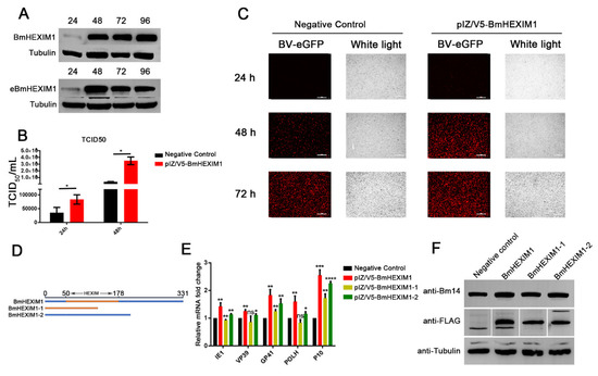 BmHEXIM1 promoted BmNPV proliferation, and its full length was essential to promote viral transcription. (A) BmN cells were transfected with pIZ/V5-BmHEXIM1 expressing plasmid, and the expression of BmHEXIM1 was analyzed by Western blot at 24 h, 48 h, 72 h, and 96 h. (B) TCID50 end-point dilution was used to evaluate the production of infectious BV at 24 h and 48 h. (C) The infected cells (the cells with green fluorescence) were observed by an inverted fluorescence microscope at 24 h and 48 h (bar = 100 μm). (D) Determination of the region of BmHEXIM1 promoted BmNPV proliferation. (E) BmN cells were transfected with pIZ/V5-BmHEXIM1, pIZ/V5-BmHEXIM1-1, and pIZ/V5-BmHEXIM1-2 expressing plasmid for 48 h. Then, the cells were infected with BmNPV for 48 h. The viral gene’s expression was measured by qRT-PCR analysis. (F) BmNPV abundance was assessed by analyzing the expression levels of Bm14 by Western blot. The mRNA level of target genes was normalized to the internal control (BmRPL32). Data represent mean ± SEM of the three independent experiments. The number of asterisks represents the degree of significance with respect to p-value. P-values were provided as * p < 0.05; ** p < 0.01; *** p < 0.001; **** p < 0.0001.