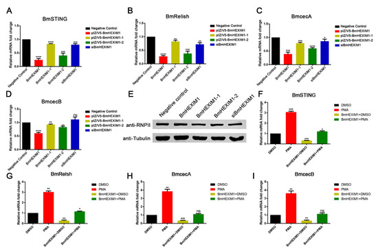 BmHEXIM1 suppresses host innate immunity during BmNPV infection. (A–D) Quantification of the expression of BmSTING, BmRelish, BmcecA, and BmcecB by qRT-PCR after overexpression of BmHEXIM1, BmHEXIM1-1, BmHEXIM1-2, or knockdown of BmHEXIM1 in BmN cells after BmNPV infection. (E) The phosphorylation level of RNP Ⅱ by Western blot after overexpression of BmHEXIM1, BmHEXIM1-1, BmHEXIM1-2, or knockdown of BmHEXIM1 in BmN cells. (F–I) In the absence or presence of PMA, the expression of BmSTING, BmRelish, BmcecA, and BmcecB was also analyzed by qRT-PCR or by the co-expression of HEXIM1. The mRNA level of target genes was normalized to the internal control (BmRPL32). Data represent mean ± SEM of the three independent experiments. The number of asterisks represents the degree of significance with respect to p-value. p-values were provided as * p < 0.05; ** p < 0.01; *** p < 0.001; **** p < 0.0001.