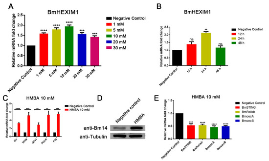 HMBA inhibited BmRelish-mediated pathway and promoted BmNPV proliferation. (A) BmN cells were stimulated with increasing concentrations of HMBA (1, 5, 10, 20, and 30 mM) for 24 h, and the expression levels of BmHEXIM1 were measured by qRT-PCR analysis. (B) BmN cells stimulated or not with HMBA (10 mM) for 12 h, 24 h, and 48 h and the expression of BmHEXIM1 were measured by qRT-PCR analysis. (C) BmN cells stimulated with HMBA (10 mM) for 24 h and the expression of viral genes were measured by qRT-PCR analysis. (D) BmN cells stimulated with HMBA (10 mM) for 24 h, and then added BmNPV for 48 h. BmNPV abundance was assessed by analyzing the expression of Bm14 by Western blot. (E) BmN cells stimulated with HMBA (10 mM) for 24 h and the expression levels of BmSTING, BmRelish, BmcecA, and BmcecB were measured by qRT-PCR analysis. The mRNA level of target genes was normalized to the internal control (BmRPL32). Data represent mean ± SEM of the three independent experiments. The number of asterisks represents the degree of significance with respect to p-value. p-values were provided as ** p < 0.01; *** p < 0.001; **** p < 0.0001.