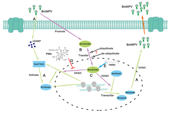 According to the results of our study, the potential mechanism of the BmHEXIM1-mediated promotion of BmNPV proliferation is summarized in Figure 6. BmHEXIM1 was significantly upregulated after BmNPV infection, while the host antiviral response was activated (Figure 6A). After BmRelish is activated by STING, BmRelish induces the expression of BmSTING and antimicrobial peptides to resist BmNPV infection (Figure 6A). Moreover, the altered subcellular localization of BmHEXIM1 after viral infection may be due to regulation by ubiquitination (Figure 6B). In addition, BmHEXIM1 represses BmRelish-dependent transcription, and thereby inhibits the host BmRelish-dependent antiviral response (Figure 6C). However, in the presence of PMA, the repression effect of BmHEXIM1 was inhibited, and BmRelish-dependent transcription was induced (Figure 6D). Moreover, HMBA may inhibit the transcription of BmRelish-dependent genes by inducing BmHEXIM1 expression (Figure 6E).
