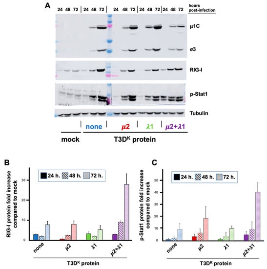 L929 cells were infected at a MOI of 0.05 TCID50 units/mL with the different viruses in the T3DS genetic background with either no substitution (none) or substitution of the μ2, λ1, or both proteins of T3DK, as indicated and as described in Materials and Methods. Proteins were recovered from infected cells at different times post-infection (24, 48 and 72 h). (A) Immunoblotting analysis was performed against either virus proteins (μ1C and σ3), RIG-I, phospho Stat1 or tubulin, as indicated. The results of a representative experiment is presented. (B,C) Immunoblots of three biological replicates were quantified for RIG-I in panel b and phospho-Stat1 in panel c; small correction from different loading, using tubulin was first used and then the increase in RIG-I or phospho-Stat1 was analyzed, taking into account the different amounts of viral proteins. The values obtained from T3DS with no protein from T3DK substituted were considered as “one” for all three different times.