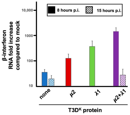 Interferon mRNA induction by RNA recovered from infected cells. L929 cells were infected at a MOI of 10 TCID50 units/cell with the different viruses in the T3DS genetic background with either no substitution (none) or substitution of the μ2, λ1, or both proteins of T3DK, as before. Total RNA was recovered at either 8 h or 15 h post-infection with the different viruses, as indicated and as described in the text. RNA was introduced by transfection, as described in Materials and Methods, and cells were recovered 8 h post-transfection. The experiment was repeated twice for singly substituted viruses (biological replicates) with RNA extracted at 8 h post-infection and each quantification reaction was performed in triplicates (technical replicates). The experiment with both other viruses was done in biological triplicates with RNA recovered at early or late time postinfection. The data were normalized to the control housekeeping gene, the mock sample was attributed a value of “one”. Even though clear difference was observed between RNA recovered at 8 h for the different viruses, statistical significance was not reached in these experiments (p = 0.07).