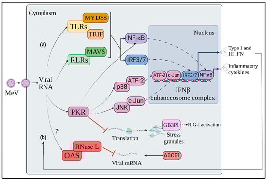 Innate immune response to MeV. (a) Soon after MeV penetration into target cells, endo-plasmic or cytosolic viral RNA is detected by TLRs and RLRs, respectively, triggering the activation of MyD88, TRIF and MAVS adaptor molecules. The three axes of RNA-dependent innate immune response converge in the activation of NF-kB, IRF3 and 7 transcription factors, in-ducing both inflammatory cytokines and IFN expression. (b) IFN-inducible antiviral molecules, such as PKR and OAS, are activated in an autocrine and paracrine manner through interaction with viral RNA. This IFN-inducible stress response contributes to limiting viral protein production through inhibition of viral translation, selective degradation of viral mRNAs and IFN response enhancement. Orange: TLR signaling axis; Green: RLR signaling axis; Pink: PKR-mediated stress response; Red: OAS-mediated stress response; Blue: IRF transcription factors; Purple: NF-kB transcription factor.