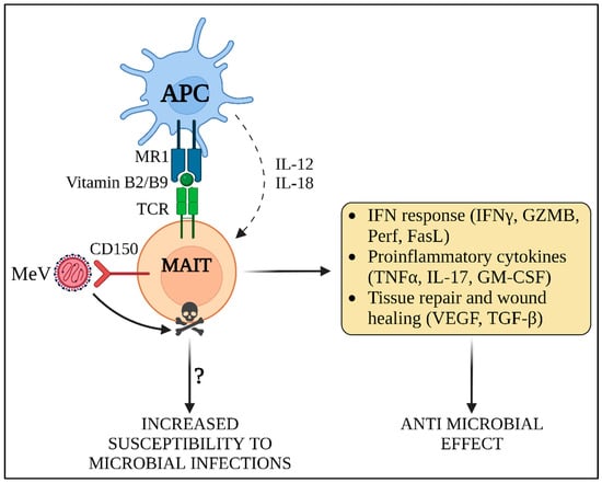 MeV-induced innate immune amnesia. MAIT cells recognize vitamin B2 and B9 metabolites presented in MR1 by antigen presenting cells (APC). In addition, they can be activated independently of MHC antigen presentation through the expression of IL-12 and IL-18 by APCs, which is the predominant mode of activation occurring in viral infections. MAIT cells contribute to the induction of IFN response and cytokine expression, exerting a direct and non-specific anti-microbial activity against invading pathogens. Moreover, they perform additional functions, such as tissue remodeling and wound healing. MeV rapidly infects MAIT and triggers their death by apoptosis. Due to the elimination of MAIT cells, the innate response against both MeV and secondary microbial infections may be suppressed, thus inducing a transient state of “innate immune amnesia”. GZMB: granzyme B; Perf: perforin; FasL: Fas ligand; TNFα: tumor necrosis factor alpha; IL-17: interleukin 17; GM-CSF: granulocyte-macrophage colony stimulatory factor; VEGF: vascular endothelial growth factor; TGF-β: transforming growth factor beta.