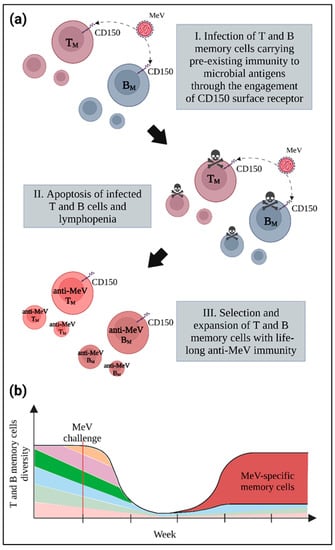 The immune paradox. (a) Infection and induction of apoptosis in memory T and B lymphocytes following MeV infection provokes lymphopenia due to the loss of pre-existing immune cells. (b) The dramatic shrinkage in memory cell pool diversity towards previously encountered pathogens, represented here by different colors, is associated with the development of a lifelong anti-MeV immunity mediated by the selection and expansion of T and B memory cells with specificity for MeV, represented in red.
