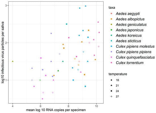 Statistical analyses revealed a statistically significant positive correlation (Spearman’s r 0.52, p = 0.0001) for the mean body titer and the mean saliva titer for the tested mosquito populations, temperatures and days post infection (Figure 1; Figure S1 (Supplementary Materials)).