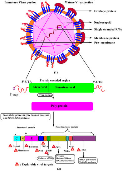 Seven non-structural proteins, NS1, NS2A, NS2B, NS3, NS4A, NS4B, and NS5, are present in the C′ terminus of the viral polyprotein and mainly responsible for the viral replication process. Structural features and their functions are represented in Table 1.